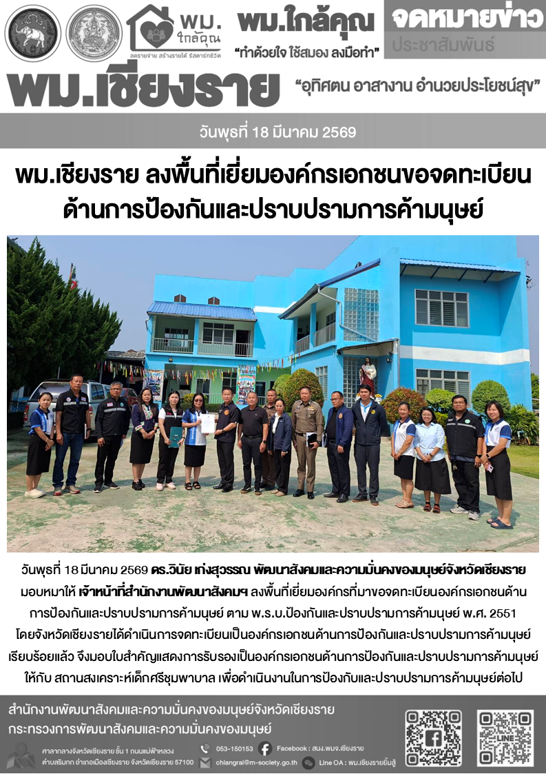 The Chiang Rai Provincial Office of Social Development and Human Security (MSDHS), led by Dr. Winai Kengsuwan, Provincial Social Development and Human Security Officer, together with relevant officials, conducted a field visit to a private organization applying for registration as an anti-human trafficking organization in Chiang Rai Province.